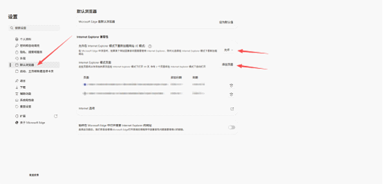 2、选择左侧的“默认浏览器”功能后,将“允许在 Internet Explorer 模式下重新加载网站 (IE 模式)”的值设置为“允许”。如未找到相应功能,请尝试在左上角的搜索栏中搜索关键字“兼容性”。