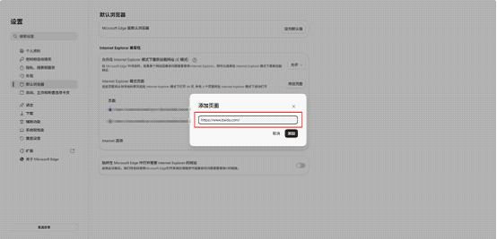 3、继续在“默认浏览器”功能中点击“添加页面”按钮,将需要兼容性访问的网址复制到下图红框处后点击“添加”。(注:1、网址建议通过浏览器地址栏进行复制,如采用手动输入请注意格式。2、存在多个不同网址需要添加的情况时,勿将所有网址一次性添加,请按此步骤逐一进行操作。)