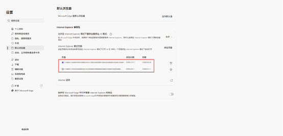 4、当完成网址添加后,在下图红框处应显示相应网址、添加时间、到期时间。当在到期时间后继续使用Microsoft Edge浏览器访问该网址时,浏览器会有相应提示,后续根据相应提示进行简化操作即可继续设置兼容模式。
